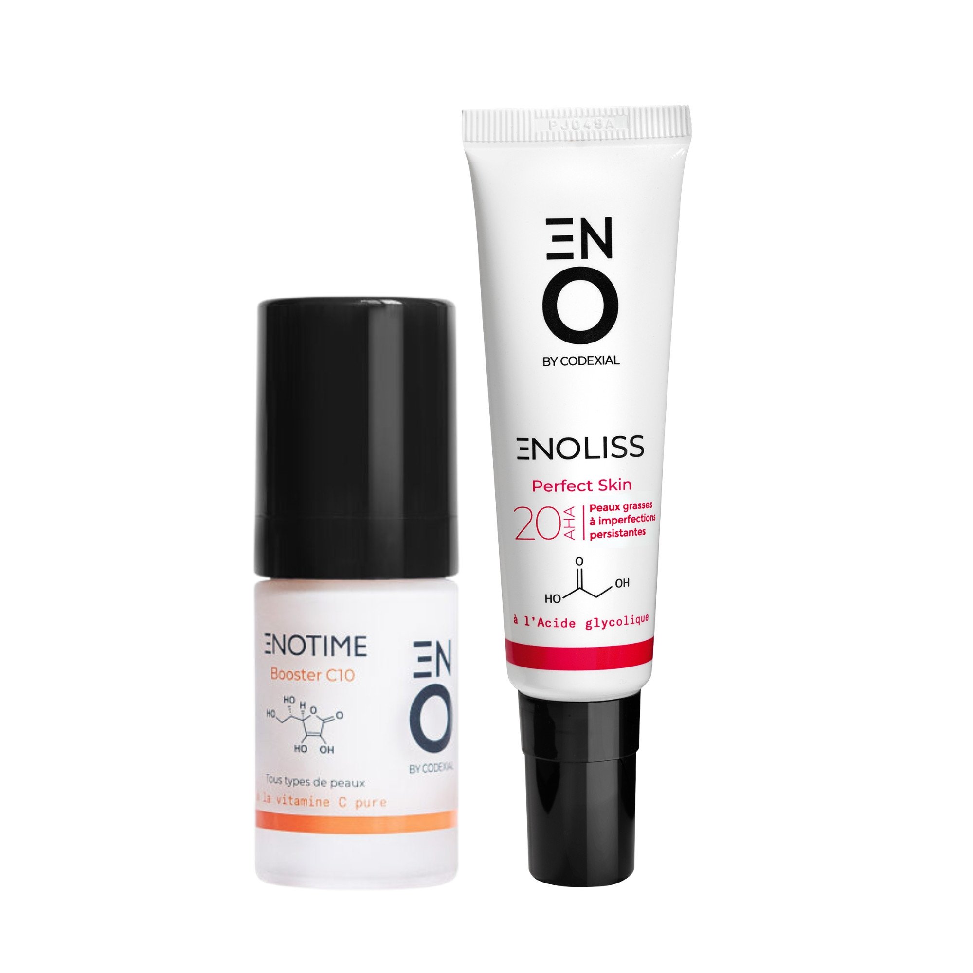 Le matin, le Booster C10, concentré à 10 % de vitamine C pure, agit comme un bouclier antioxydant. Il neutralise les radicaux libres responsables du vieillissement prématuré, ravive l’éclat, lisse les ridules et unifie le teint. Le soir, ENOLISS 20 prend le relai : grâce à 20 % d’acide glycolique (AHA), il exfolie la peau, élimine les cellules mortes, affine le grain de peau et stimule le renouvellement cellulaire. Il améliore aussi la pénétration des actifs appliqués ensuite, ce qui renforce l’efficacité de votre routine de soins.